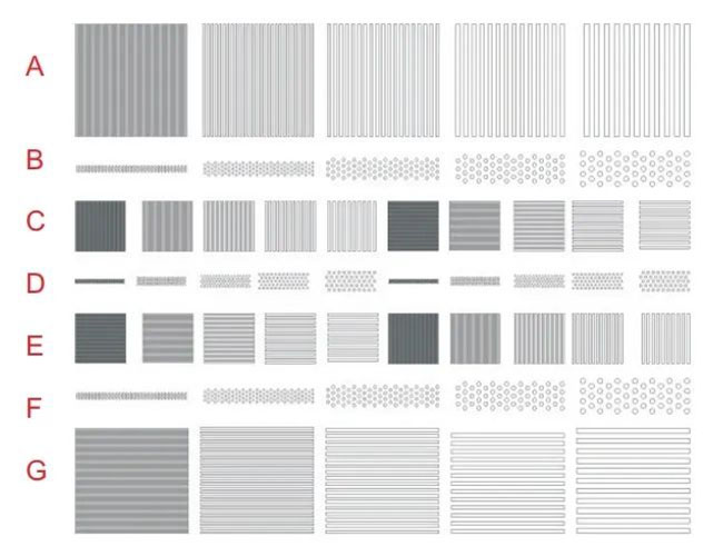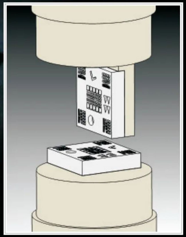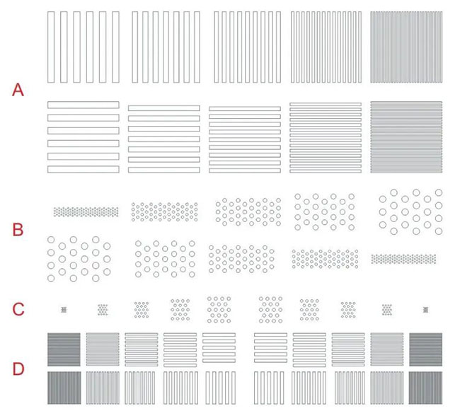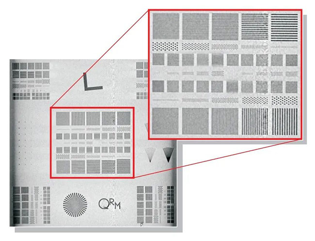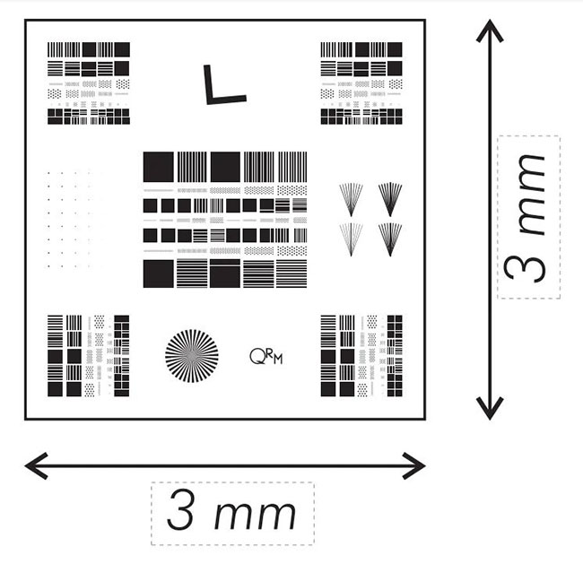 納米型顯微CT柱狀測(cè)試圖樣模體(MicroCT Bar Pattern NANO Phantom),內(nèi)含兩個(gè)3 x 3 mm² 硅質(zhì)芯片,分別水平和垂直安裝,通過(guò)塑料支架固定在模體的中心位置。雙硅芯片上均呈現(xiàn)數(shù)組線狀或點(diǎn)狀圖樣,線寬和點(diǎn)直徑從1µm到15µm不等,結(jié)構(gòu)的深度在5和15µm 之間變化。用戶僅通過(guò)一次曝光和測(cè)量,就可以對(duì)整個(gè)芯片的中心以及外圍的分辨率做出評(píng)估。通過(guò)最直接、可見的方式評(píng)估3D高分辨率顯微CT(Micro-CT)系統(tǒng)的平面及軸向空間分辨率。