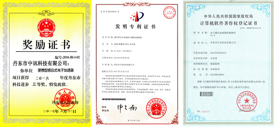 丹東市中訊科技有限公司自主研發(fā)的,具有自主知識產(chǎn)權(quán)的新產(chǎn)品“便攜型感應(yīng)式電子加速器”榮獲“2016年度丹東市科技進(jìn)步三等獎”。