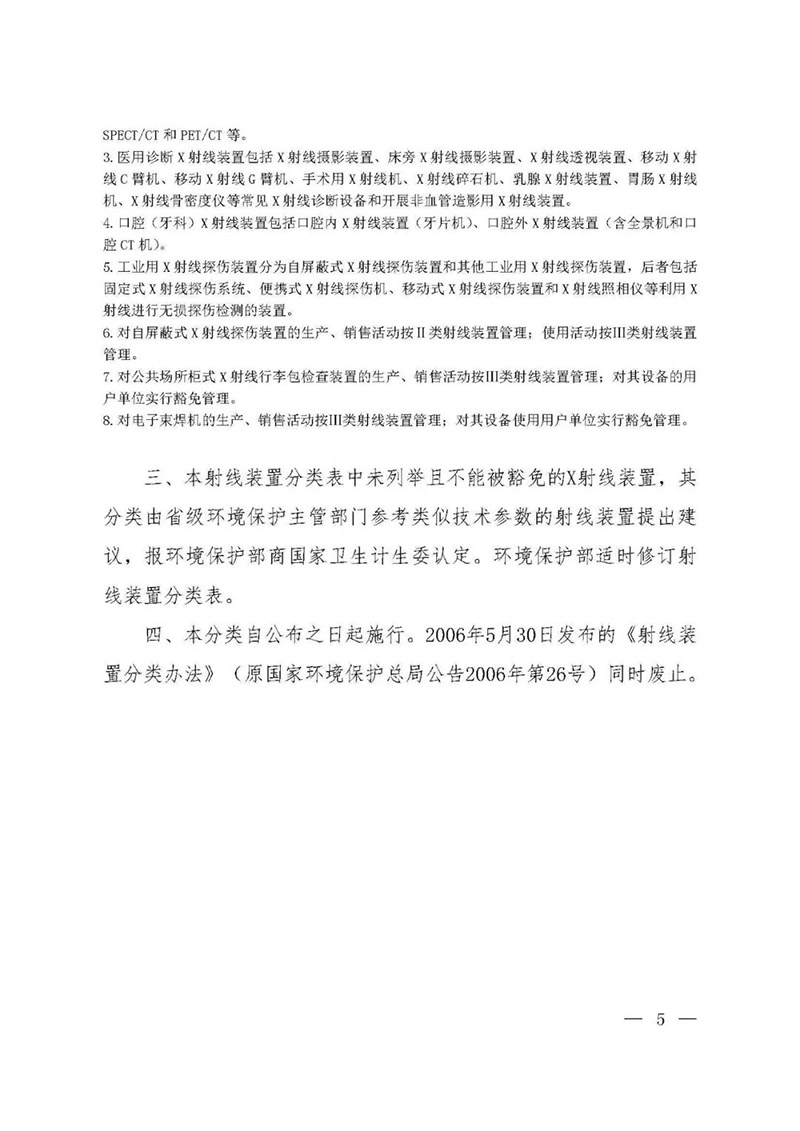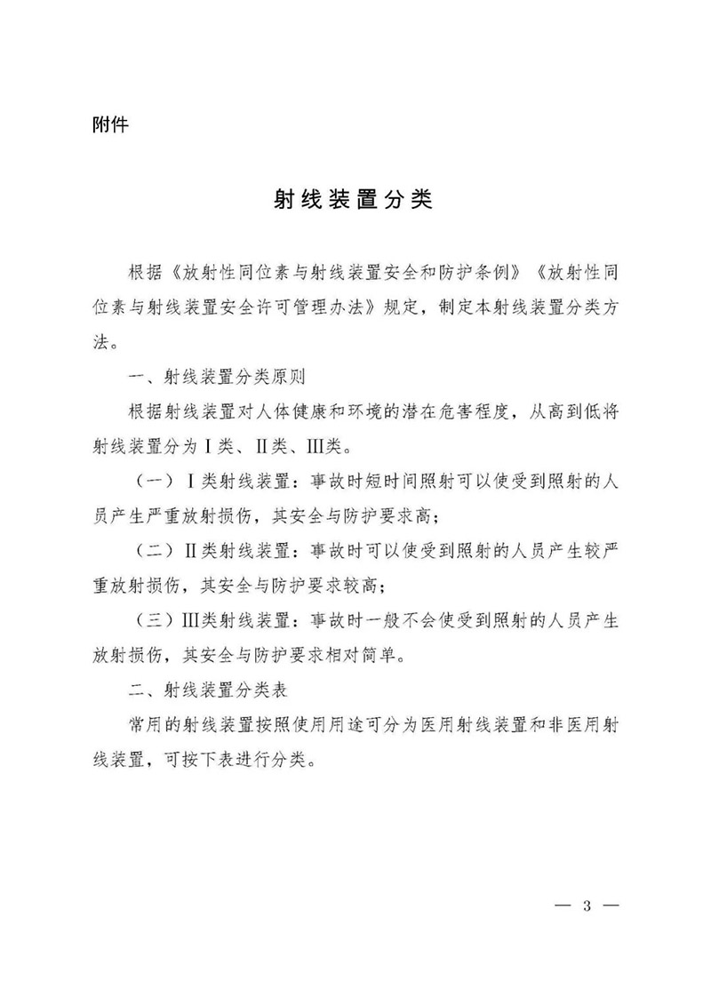 關(guān)于發(fā)布《射線裝置分類》的公告根據(jù)《放射性同位素與射線裝置安全和防護(hù)條例》(國務(wù)院令第449號(hào))關(guān)于射線裝置實(shí)行分類管理的規(guī)定,環(huán)境保護(hù)部和國家衛(wèi)生計(jì)生委對(duì)現(xiàn)行的《射線裝置分類辦法》(原國家環(huán)境保護(hù)總局公告2006年第26號(hào))進(jìn)行了調(diào)整和修訂,制訂了《射線裝置分類》,現(xiàn)予公布,自公布之日起施行。原國家環(huán)境保護(hù)總局公告2006年第26號(hào)同時(shí)廢止。
